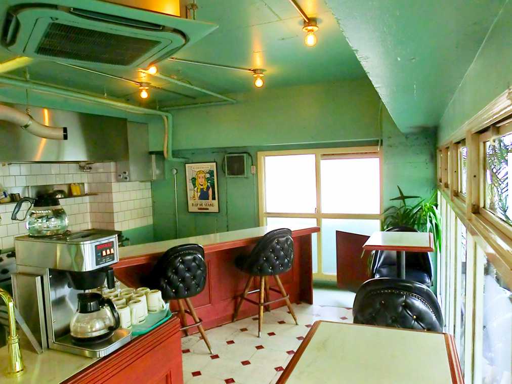 店内はまるで、映画に出てくる50年代のレトロなアメリカンダイナーのよう。お店のテーマカラーだという“ティファニーブルー”で統一された空間に、ビンテージ調の黒いスツールが映えて、とってもおしゃれです!