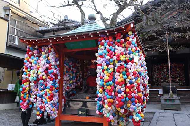 東山のシンボル、八坂の搭の真下に位置する八坂康申堂。境内でひときわ目を引くのは、場違いなほどポップでカラフルな「くくり猿」です。手足を縛られた猿の人形を本尊のお堂にくくりつけ、欲をひとつ我慢して願掛けすると叶うといわれています。人形は奉納してもよいですが、持ち帰ってお守りにしてもOK!