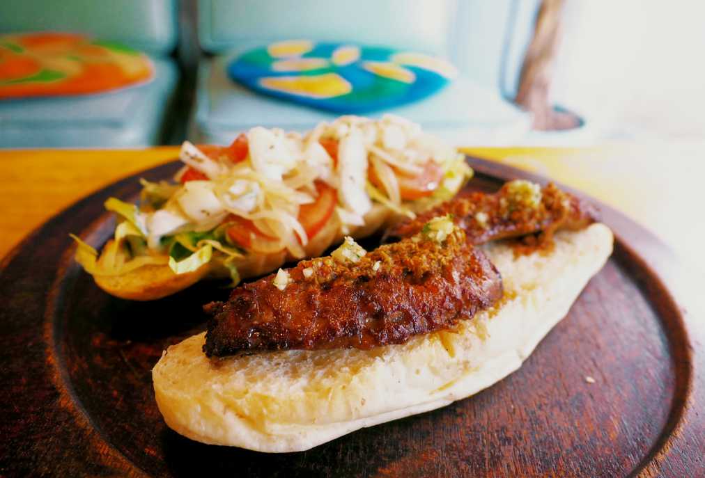 「チョリパン」とはアルゼンチンで愛されているソウルフードのこと。太いチョリソーに、野菜やスパイス、ソースをたっぷりトッピングし、パンで挟んでいます。