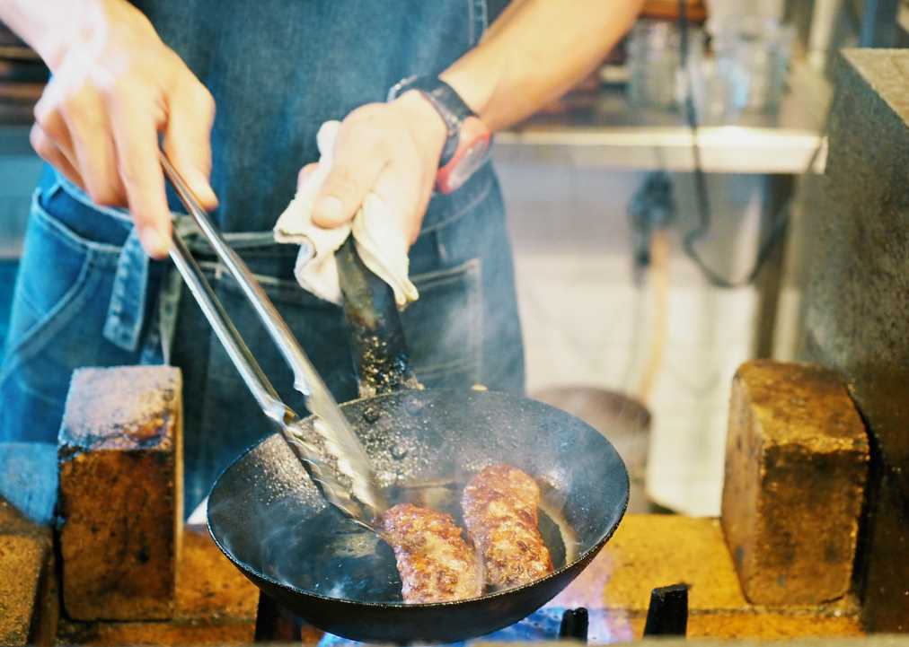 注文が入ると、店主が日々手作りしている、オリジナルブレンドのスパイスをきかせたチョリソーがフライパンに投入されます。ジュウジュウ音を立てて焼けるお肉のスパイシーな香りに、お腹が鳴りそう…!