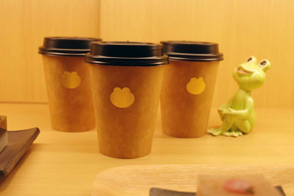 店内では、「ドリップコーヒー」(ホット・アイス)や「カフェオレ」(ホット・アイス)などのテイクアウトも行なっています。ゴールドに輝くカエルのマークがついたカップがとってもおしゃれ!
