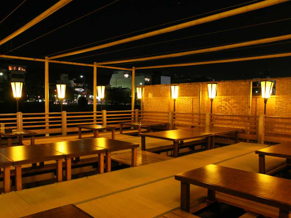 人気の床席は、日が完全に沈むと灯りはキャンドルと月明りだけになり、BGMは鴨川のせせらぎ。ムーディーにお酒を楽しめます。