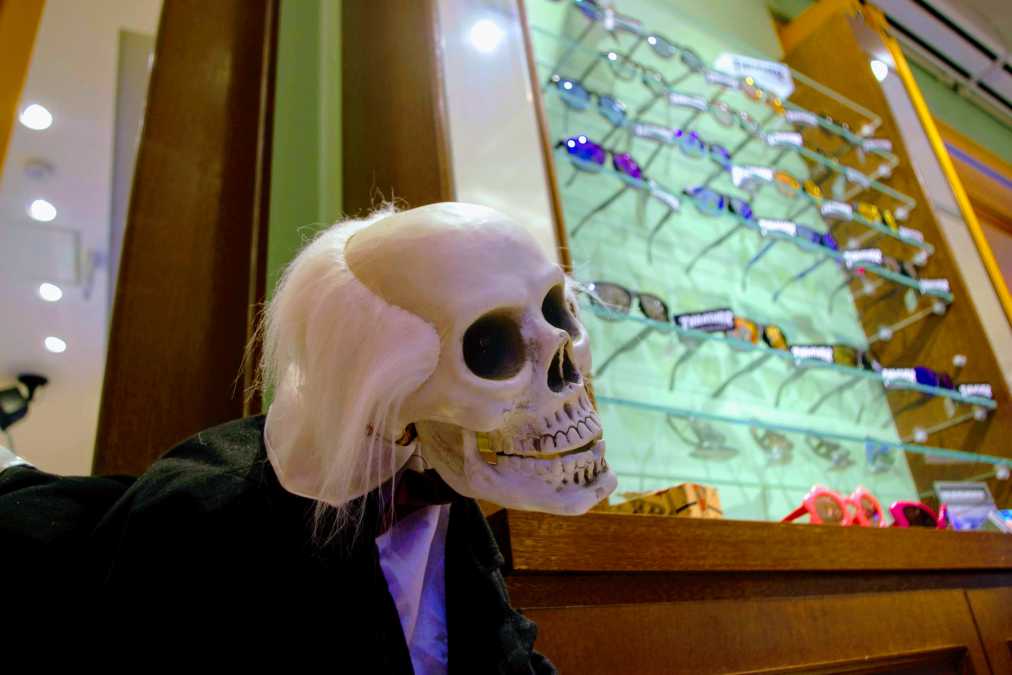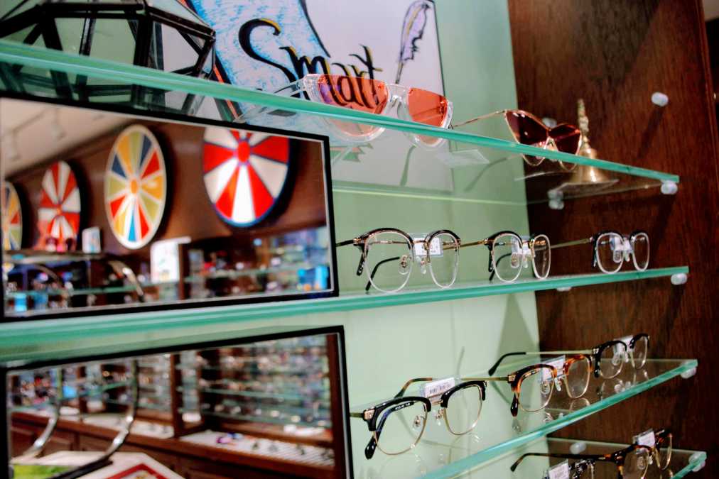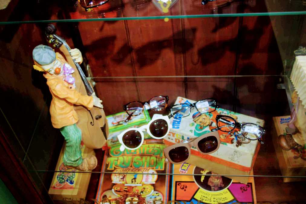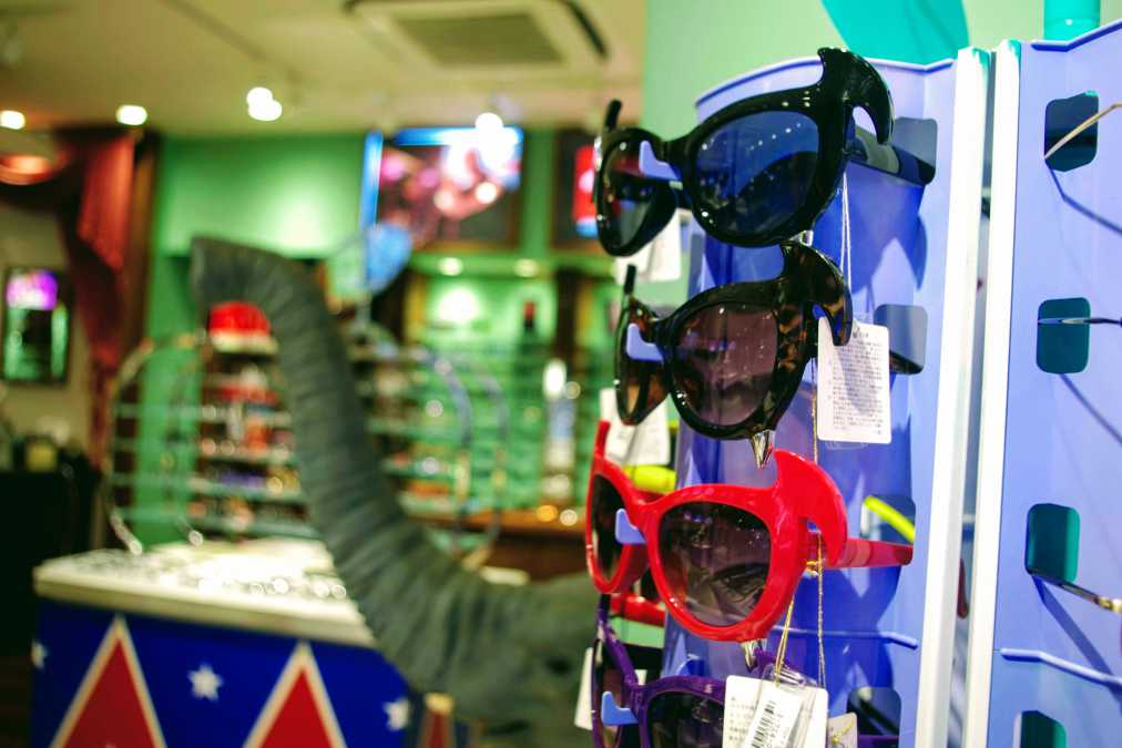 店内のレイアウトは、コンセプトである「わくわく、ドキドキ」を作るための工夫がこらされています。非日常的な空間を演出する入口には遊び心のあるサングラスシリーズが並び、メガネの陳列棚にもトランプやピエロの人形などのアイテムが飾られています。