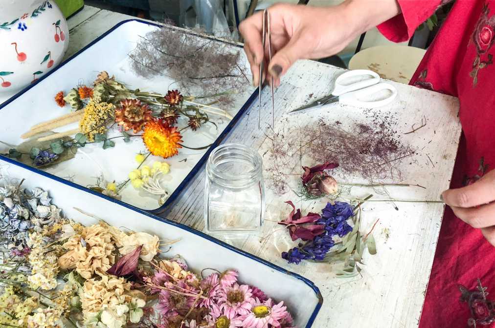 まずは自分好みの花をチョイス。「marmelo」らしいかわいい小花などを中心に、たくさんの種類の花があるので、何を詰めてもおしゃれに仕上がりそう…!選んだ花を瓶の中に詰めていきます。