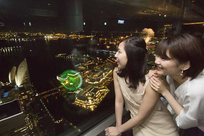 シーバスでみなとみらい21に移動後は、横浜ランドマークタワーへ。日本最速のエレベーターで、あっという間に69階に到着。展望フロア「スカイガーデン」から横浜の夜景を一望!高速道路のオレンジ色の明かりがどこまでものびていくのが印象的です。絶景夜景を眺めながらカクテルも楽しめます。