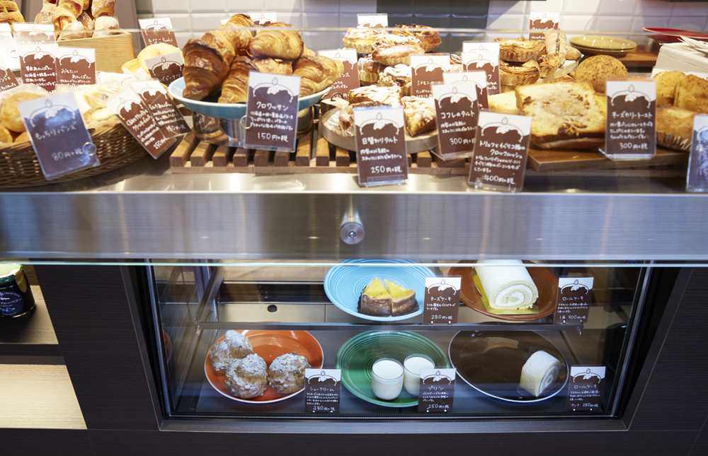 緑に囲まれた店に入ると、棚には本店から届く焼きたてのパンがずらり。窓際の棚には焼き菓子やラスクなどが並んでいます。そして、パンが並ぶ棚の下には、小さな冷蔵ショーケースもあります。