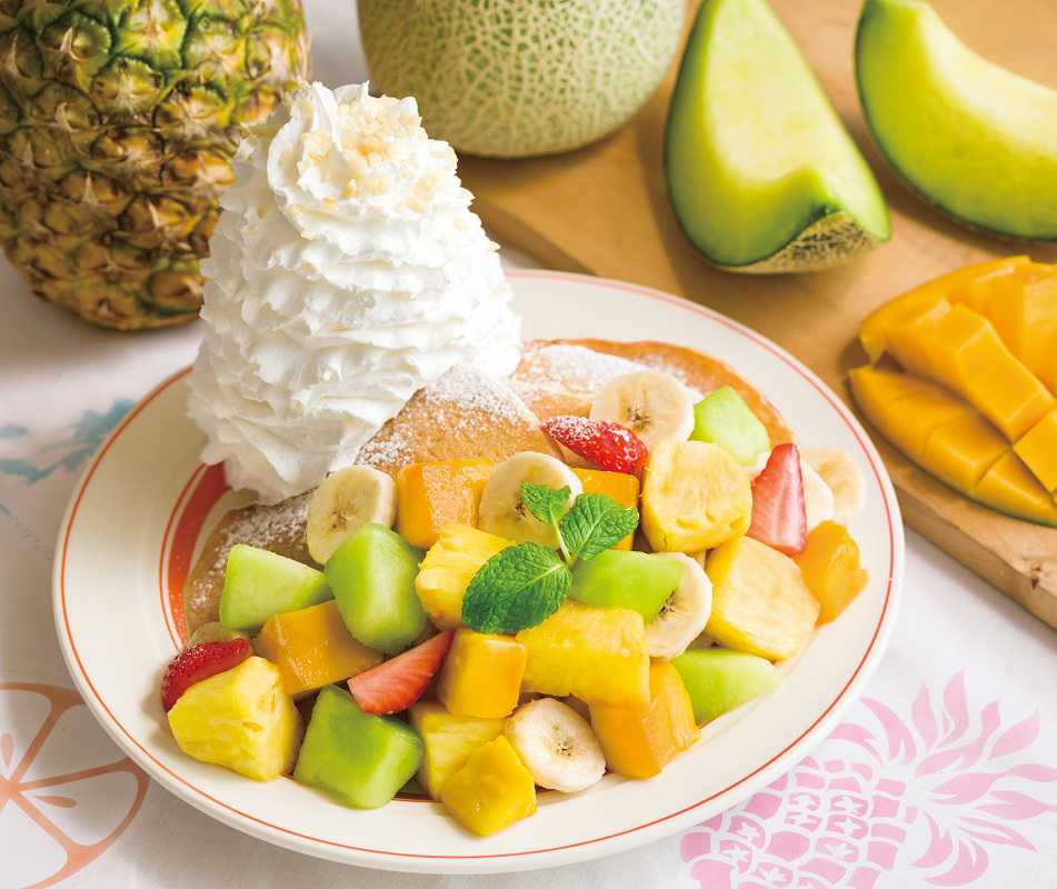 マンゴーやイチゴなどフルーツたっぷりな「サマーフルーツパンケーキ」1480円(税別)。ふわっふわなホイップクリームとフルーツの相性は抜群!