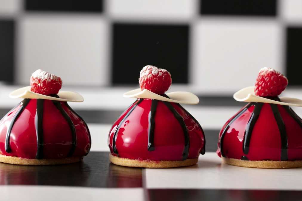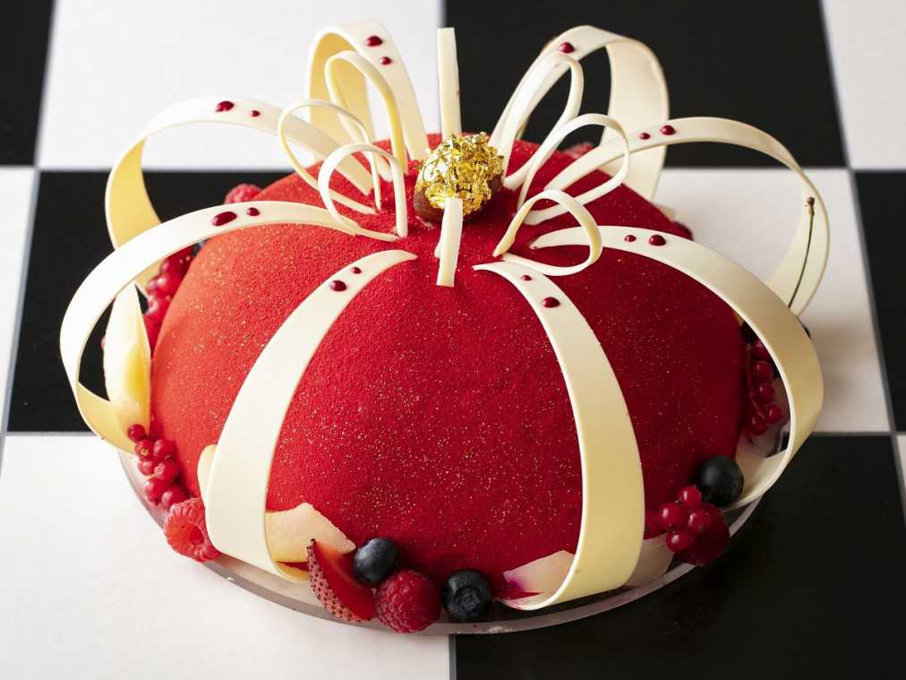 栗のババロアに洋梨、野イチゴや赤スグリをサンド、チョコレートパウダーでコーティングした「女王陛下アリス」は、まるで王冠のような堂々たる存在感!