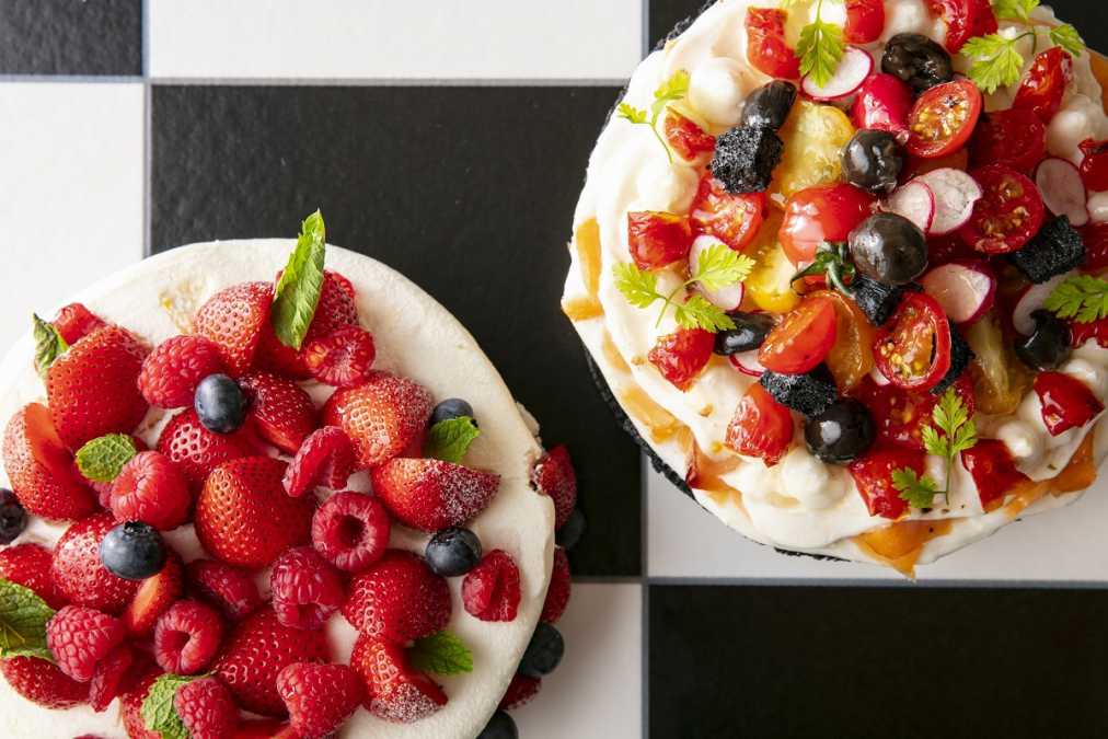 ベリー類がチョコレートスポンジにトッピングされた「ダムのオープンフェイスケーキ(※写真左下)」に対する軽食は、スモークサーモンとカリフラワームースをフォカッチャでサンドした「ディーのオープンフェイスケーキ(※写真右上)」。どちらも華やか!