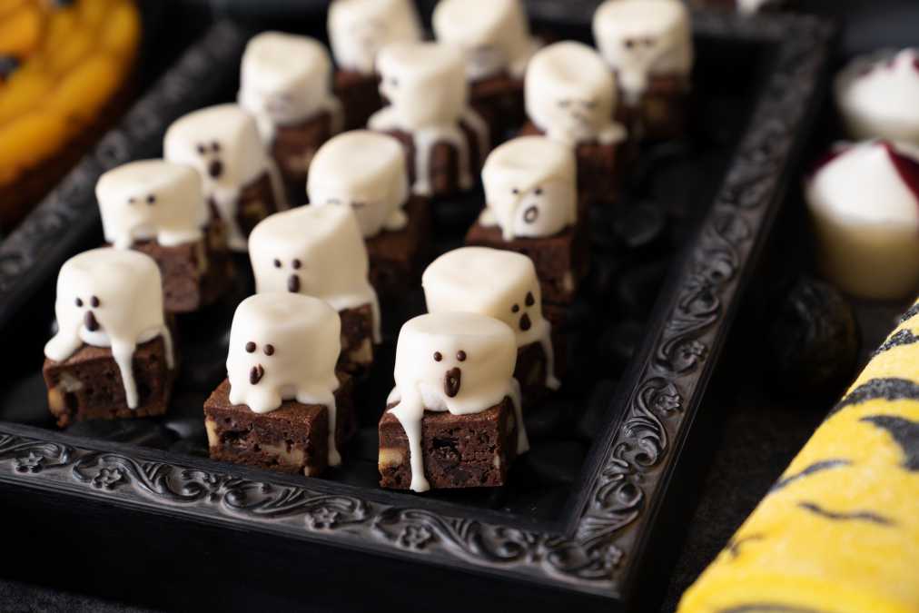 ビュッフェ台の上に造られた“ホーンテッドタワー”からホワイトチョコレートを被った「マシュマロゴースト on ブラウニー」が続々とビュッフェ台に降り立つ演出がキュート!ゴーストたちは、一体ずつ表情が違っていて思わず笑ってしまうおとぼけ顔も!?