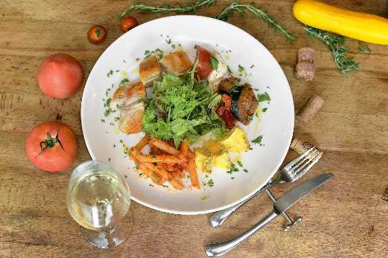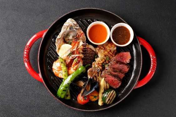 「魚貝とワインと時々お肉 YOKOHAMA Mar Mare」からは、「マルマーレのミックスグリルプレート」1706円。新鮮な魚貝・野菜・お肉を和食の五法で調理した、ボリュームたっぷりで彩り鮮やかなワンプレートです。