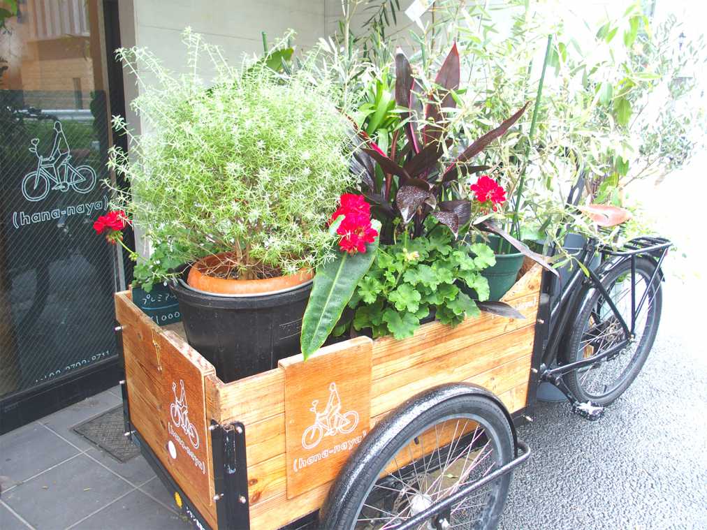「(hana-naya)」は中目黒駅から徒歩約5分のところにあります。店先に置いてある木目調のカーゴバイクが目印です。一見キュートなインテリアのようですが、実際にデリバリーサービスにも使うアイテムなのだとか。カーゴバイクにお花を乗せて、引き売りすることもあるそう。街中で見つけられたらラッキーですね!