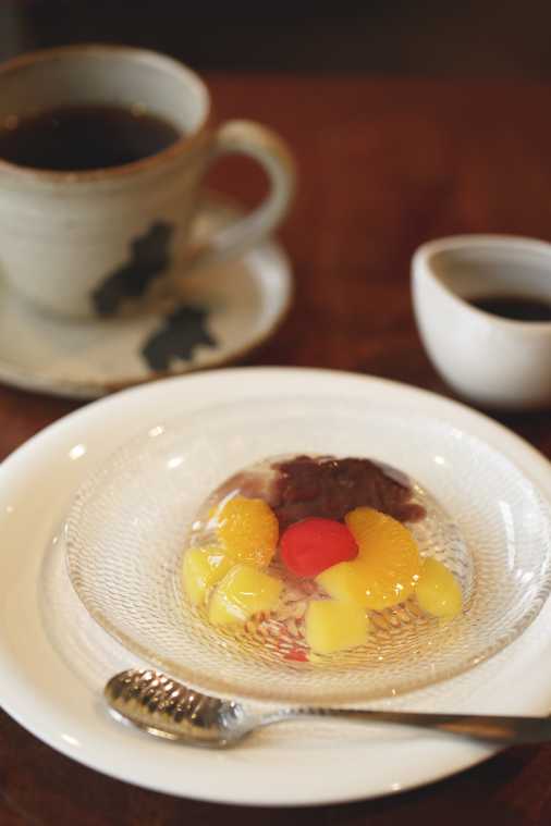まずは、ビー玉のような見た目が素敵な「あんみつ玉」(500円)。寒天ゼリーでフルーツや餡を包むという、逆転の発想から生まれたスイーツです。そっとスプーンで切り取って口に運ぶと、のどごしのいいゼリーとフルーツがバランスよく、これまでに食べたあんみつとは違う食感と風味のハーモニー!別添えの黒蜜は自家製で、甘すぎず、あんみつ玉の魅力を引き出します。