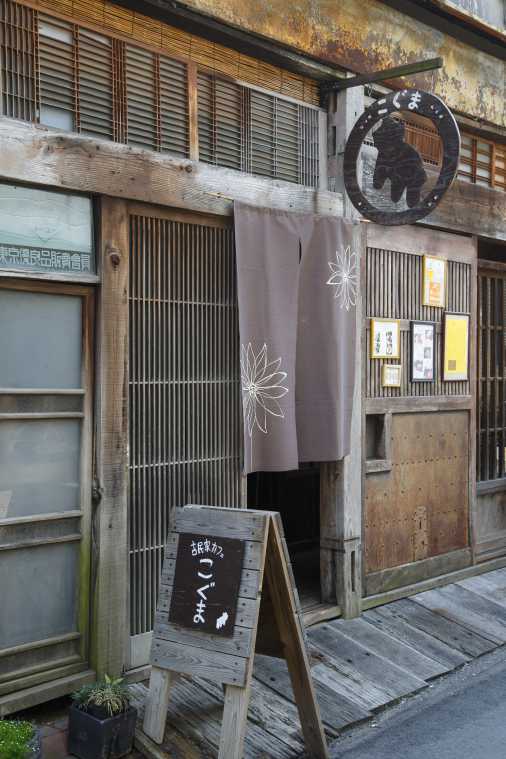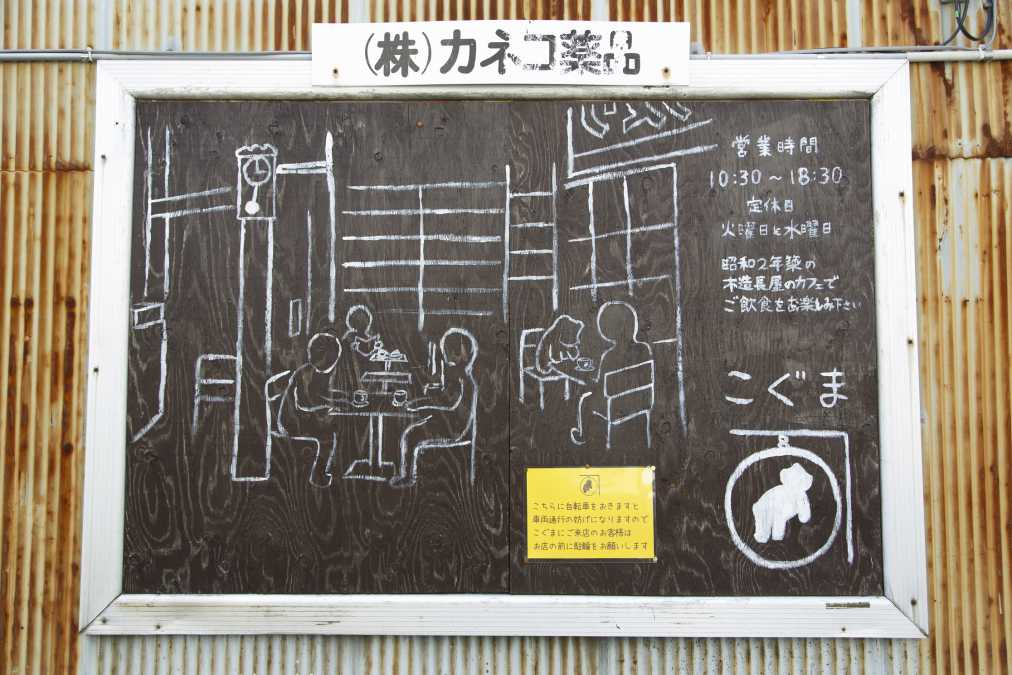 約90年の歴史を持つ、墨田区向島の「鳩の街通り商店街」。昔ながらの喫茶店や美容室、銭湯に、若きクリエイター集うアトリエなど、新旧さまざまな店舗が並ぶその通りの一角に「古民家カフェこぐま」はあります。東武スカイツリーライン曳舟駅から歩くこと約8分、トタン壁に貼られた「カネコ薬局」の看板がお店の目印です。