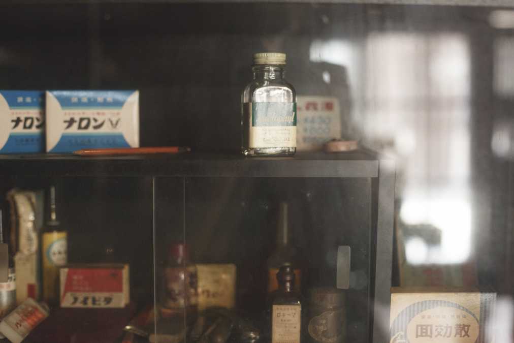 ノスタルジックなインテリアは「譲り受けた古きよきものを、なるべくそのまま残したい」という店主・山中明子さんの思いから。薬局時代に使われていた薬棚には、レトロなパッケージの薬や道具が並びます。机や椅子は、学習塾で使われていたものを譲り受けたそうで、落書きや彫られた文字がリアル。青春時代が蘇り、なんだかくすぐったくもセンチメンタルな気持ちになりそう…。