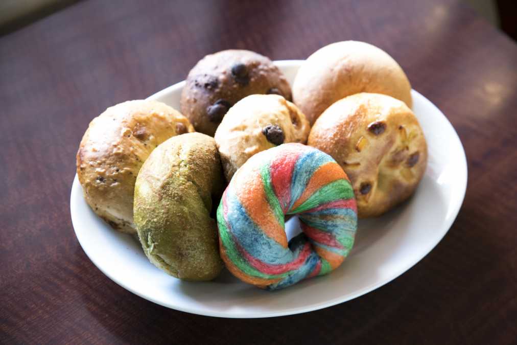 店内ではプレーンやショコラなど、さまざまな味のベーグル(190円〜)が味わえます。特にレインボーベーグルは、インスタ映え必至の華やかなヴィジュアル。濃厚なチョコレートを生地に練りこんだ「ショコラ」、抹茶やあずきがたっぷり入った「抹茶小豆きなこ」なども人気です。