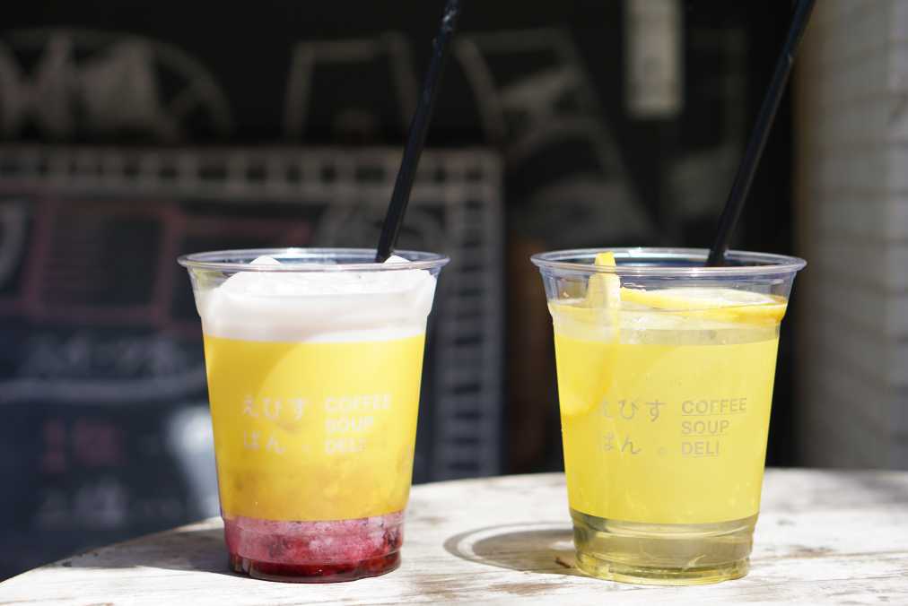 「えびすぱん」でカフェタイムを楽しむなら、ヴィネガードリンクもオーダーしましょう。今回は自家製の「ミックスベリーヴィネガー」(左)、「レモンヴィネガー」(右)各250円をオーダー。ヴィネガードリンクはベースの味を選んだら、ソーダ、水、ミルクで割ることができます。「ミックスベリーヴィネガー」はミルクで割るとヨーグルトのようなまろやかな味わいに。「レモンヴィネガー」はソーダでさっぱりいただきました。