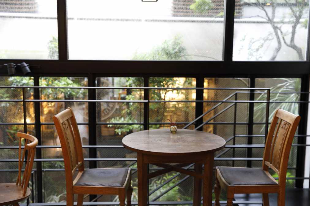 窓際の席は緑を望むオアシスのようなスポットです。木材を生かしたインテリアも心安らぐポイント。植物の力を大切にするニールズヤードならではのこだわりがうかがえます。店の奥、テラスを挟んで位置するのが直営店です。