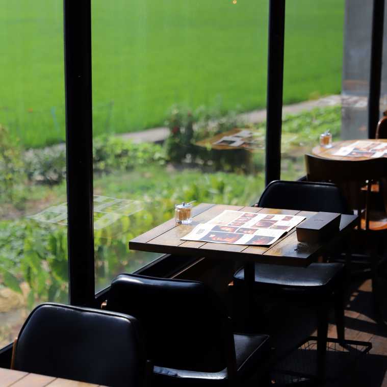 田畑を眺められる窓際席や、お店の方と向き合って過ごすことができるカウンター、店内全体を見下ろせる階段上の隠れ家席など、どこでどう過ごすも、ばっちりリラックスできます。