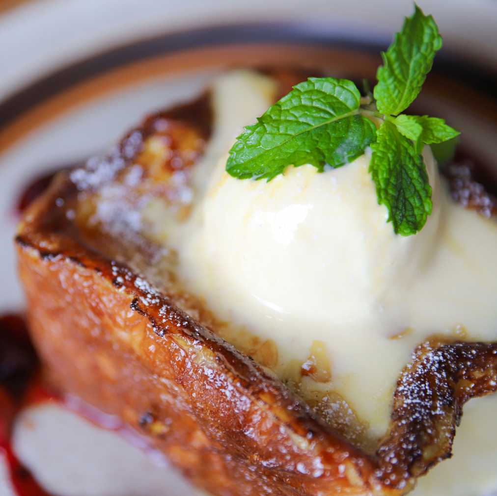 まんまるとしたアイスクリームがセンターを飾るフレンチトースト。ぱりぱりっと弾ける香ばしさと、溶け出したアイス&キャラメルが絶妙に絡み合い、力強い甘さを発揮。止めどなく広がり続ける余韻に、お口がでろーんとなっちゃいます。