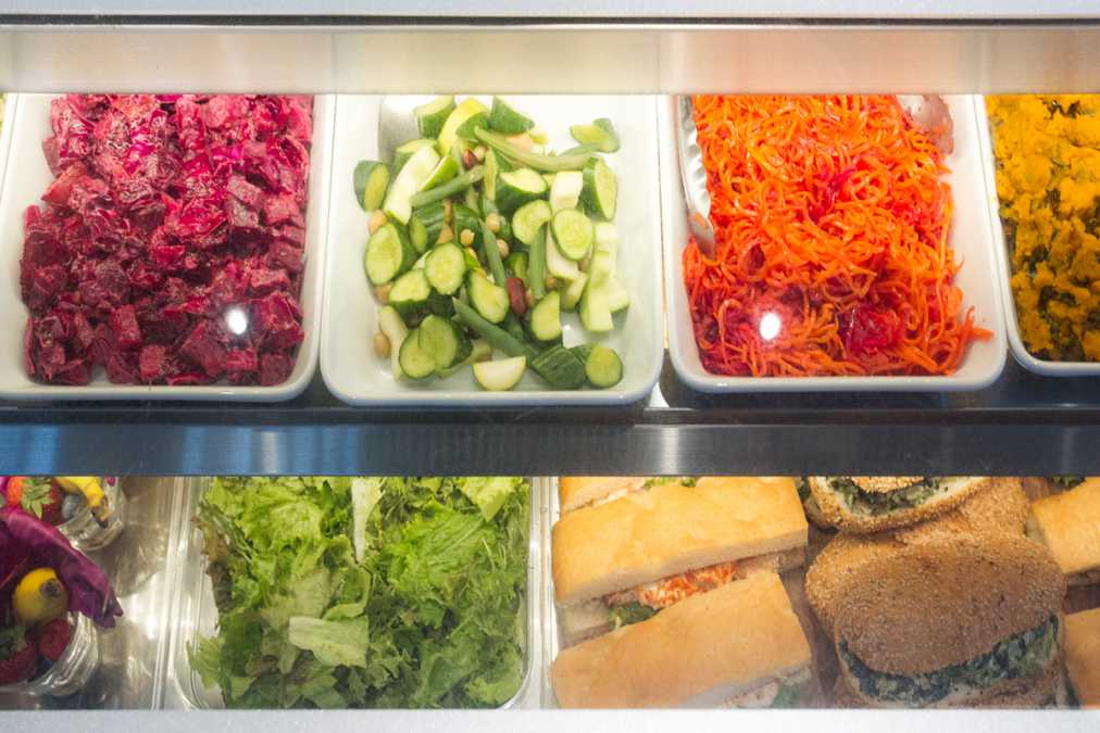 季節野菜のデリは1品162円でテイクアウトも可能。デリやサラダ、ローストポーク、ローストチキン、パン、スープを組み合わせたおすすめ盛り(648円)もでき、ランチにぴったりです。