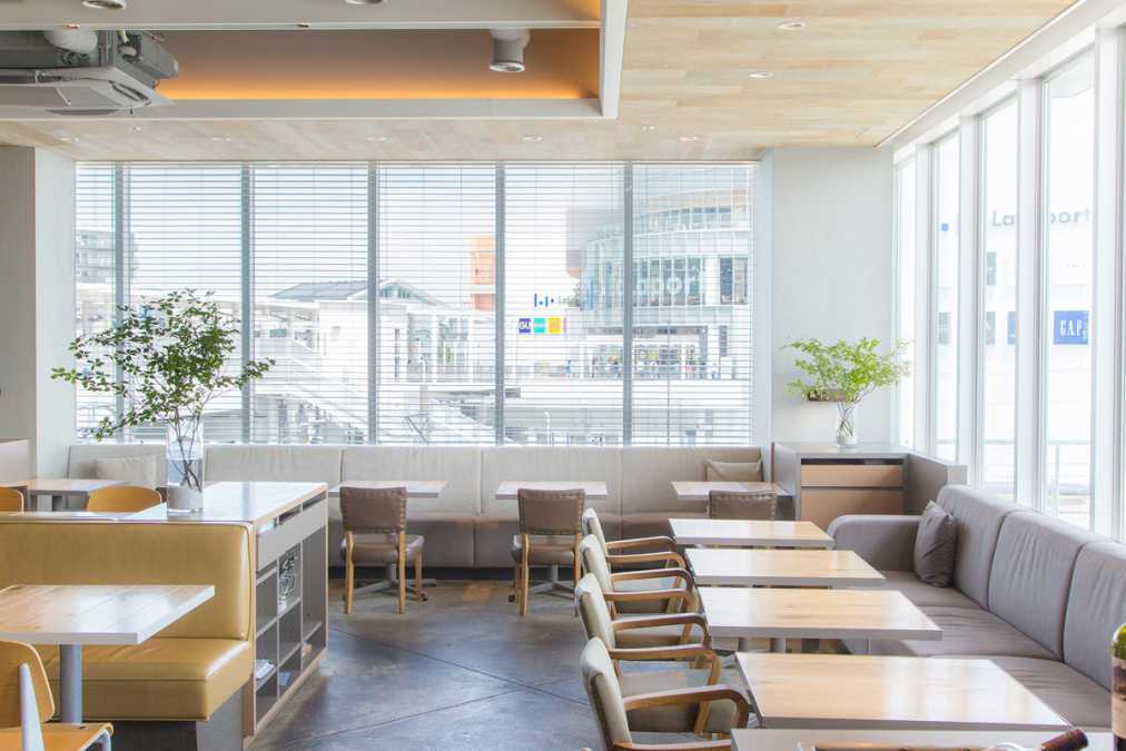 店内は色味を抑えたシンプルなインテリア。大きな窓から光が差し込む、明るく開放的な空間に全64席があります。窓際の席はソファで、居心地も抜群。