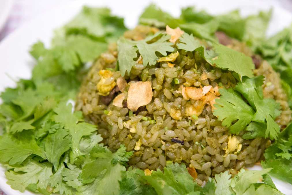 「牛肉とパクチーのガーリック焼飯」(1058円)は、自家製パクチーペーストで炒めることでご飯がグリーンに。パクチーの葉と茎もたっぷり入っています。