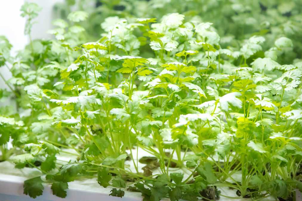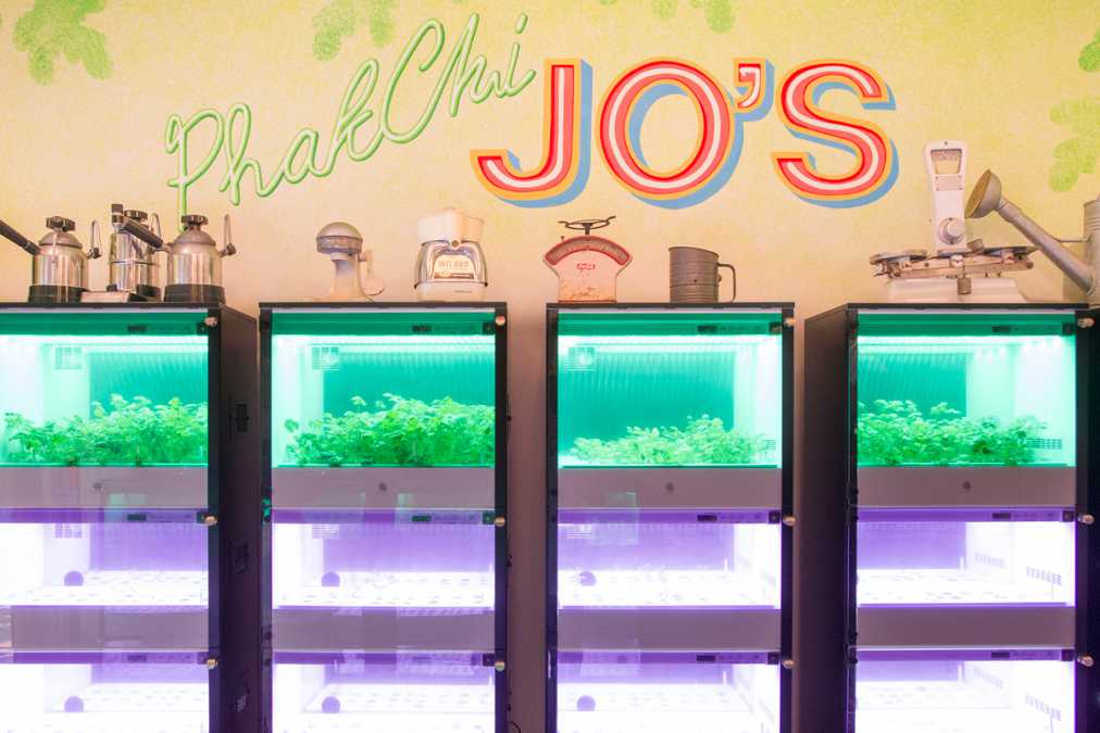 店内では水耕栽培でもパクチーを生育。下段のパープルの水槽は種まきした直後のもの、上段のグリーンは35~40日経って、そろそろ収穫可能なもの。野性味ある味わいの土耕栽培のパクチーに比べて、水耕栽培にすると茎や葉が柔らかく育つのだとか。
