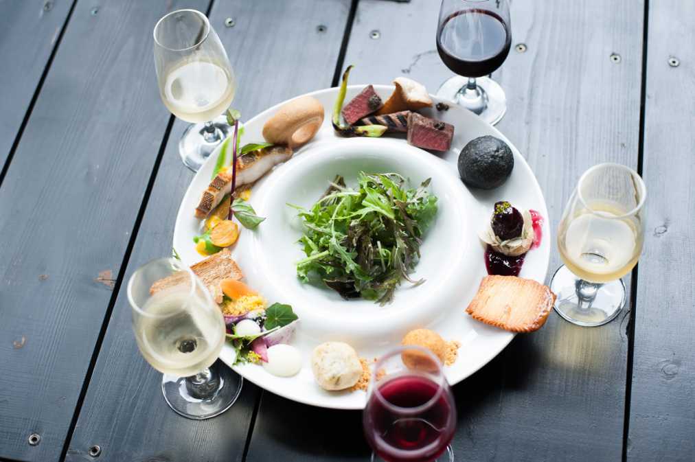 写真は、1皿目の「プティ・ディネ~COURTESYスペシャルワンプレート~」(1人前)。まるでコースメニューのように、アミューズからデザートまで全5種類の料理がワンプレートになった、芸術作品のように美しいひと皿です。