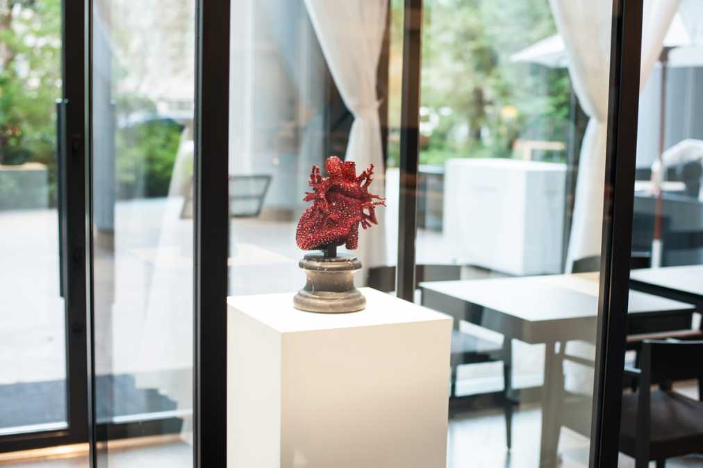 「COUTESY」は、美術館の要素をもつレストラン。店内外のいたるところに設置されたアート作品が、空間を上品に彩ります。写真は、舘鼻さんの心臓をモチーフとした彫刻作品です。