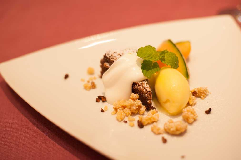 デザートは、ガトーショコラにゆずシャーベット、紅花メロンなどがひと皿になった「本日のドルチェ」。コーヒーまたは紅茶がセットです。