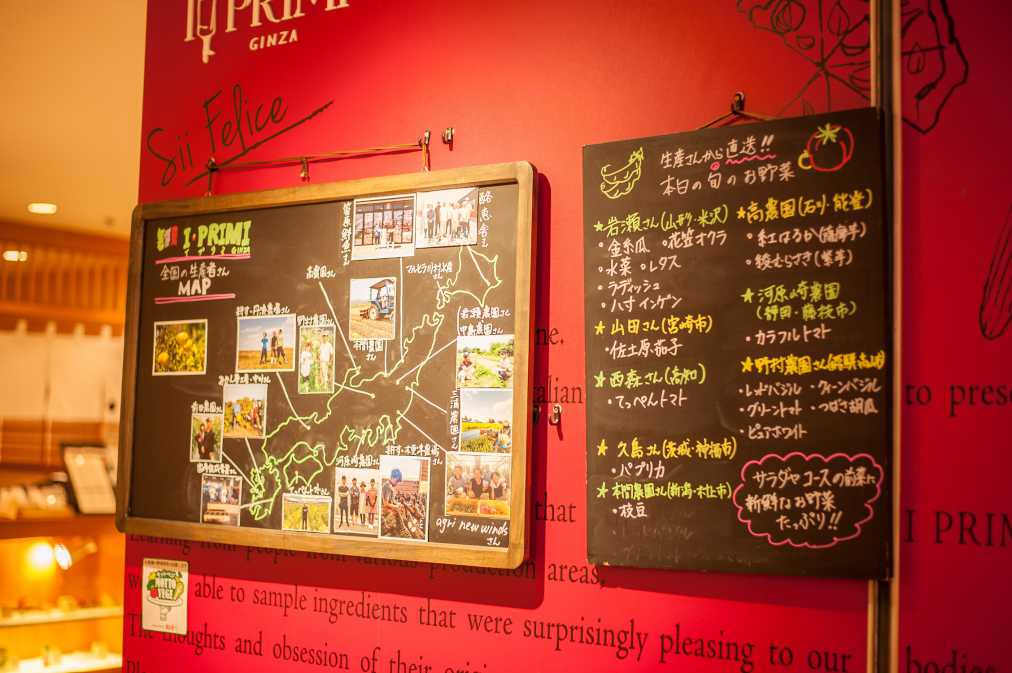 ひと口食べるごとに体が元気に、きれいになっていくような感覚が味わえる、「イ プリミ ギンザ」のメニュー。長い時間をかけて生産者の方々と信頼関係を築いた結果、いまのようなスタイルのトラットリアが完成したそう。