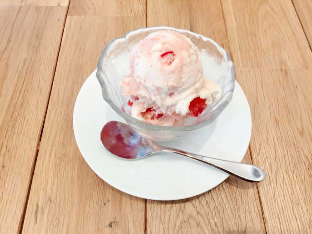 こちらも旬のフルーツのアイス(450〜480円)の一例で、すもものアイス。甘酸っぱい爽やかな美味しさです。