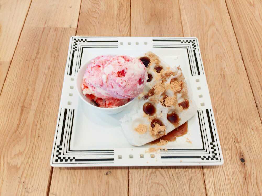 写真は旬のフルーツのアイス(450〜480円)の一例で、イチゴ(あまおう)を使ったアイス。とても濃厚で、素材のよさを感じる上品な甘さです。横に添えた焼き立てのモッフル(+50円)には黒蜜ときなこがたっぷり。モッフルも自家製の川棚米から作ったもち米を使って焼いています。