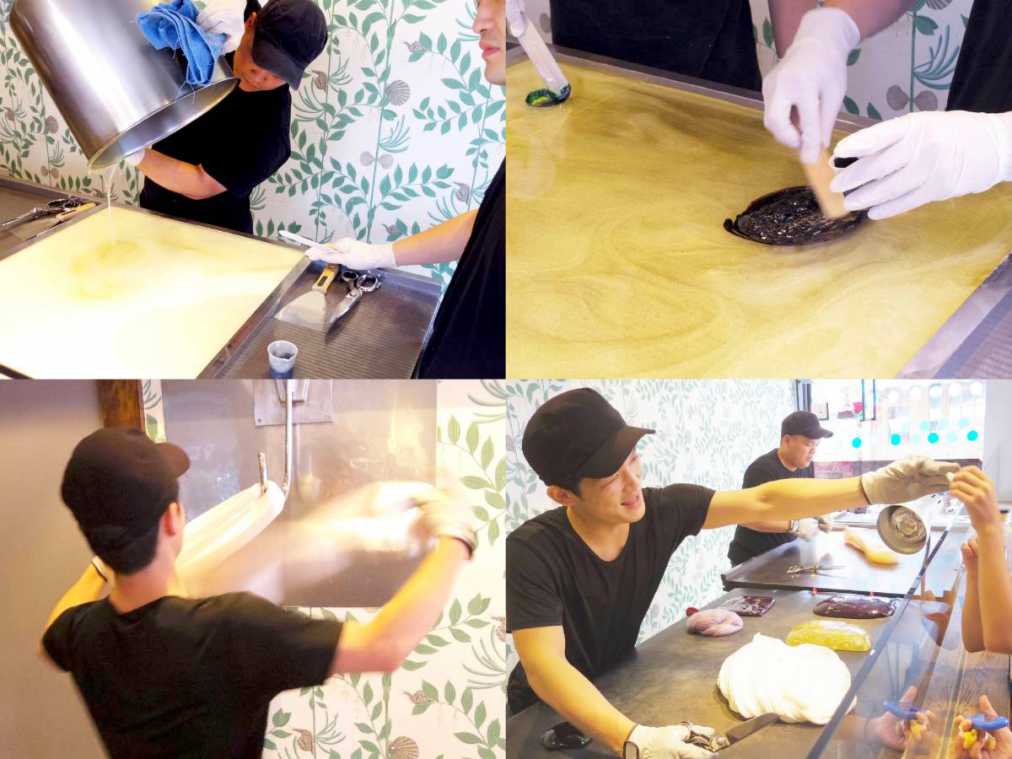 まずは160度に熱した飴を鉄板に流し込みます。ゆっくりとかき混ぜながら冷まし、着色料を流し込み、色を付けていきます。まだ100度ほどはある熱い飴を切り分け、絵柄となる飴を色ごとに分けていきます。そして、大きなフックに飴のかたまりをかけ、何度も伸ばして空気を含ませることで独特なサクサク感を生み出します。