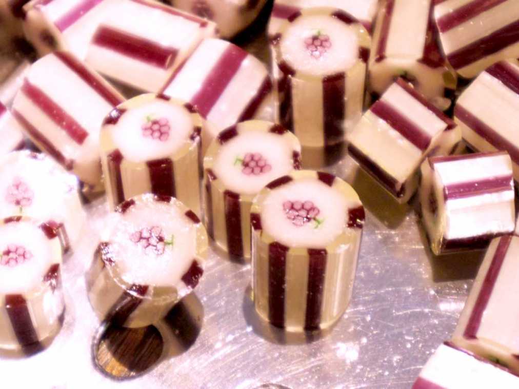 できあがり!キャンディの断面には、5mmほどのぶどうの柄が見事に描かれています。聞くところによると、日本人の繊細な舌に合うように、酸味と甘みのバランスも工夫されているんだとか。
