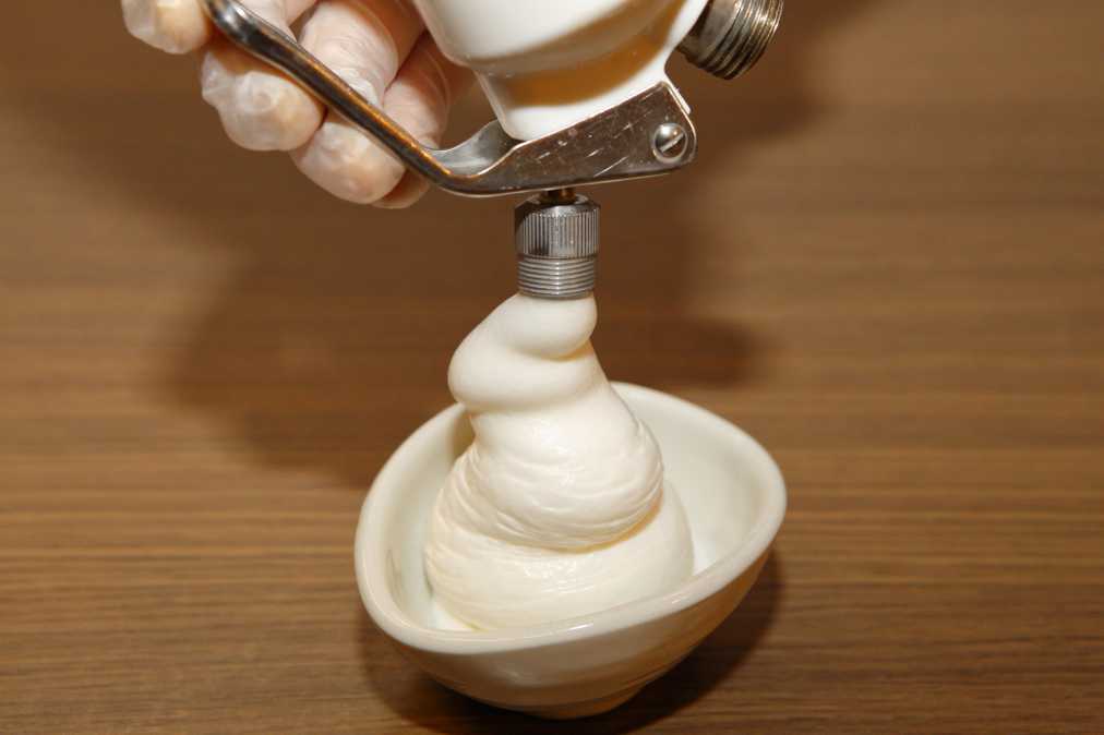「吾妻茶寮」では、かき氷の種類ごとに特製シロップを作ってエスプーマにしています。「極みるく」は、自家製ミルクを炭酸ガスで泡状にした口当たりなめらかなエスプーマがたっぷり。