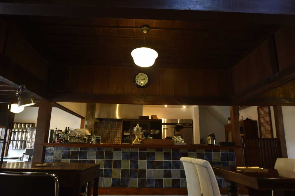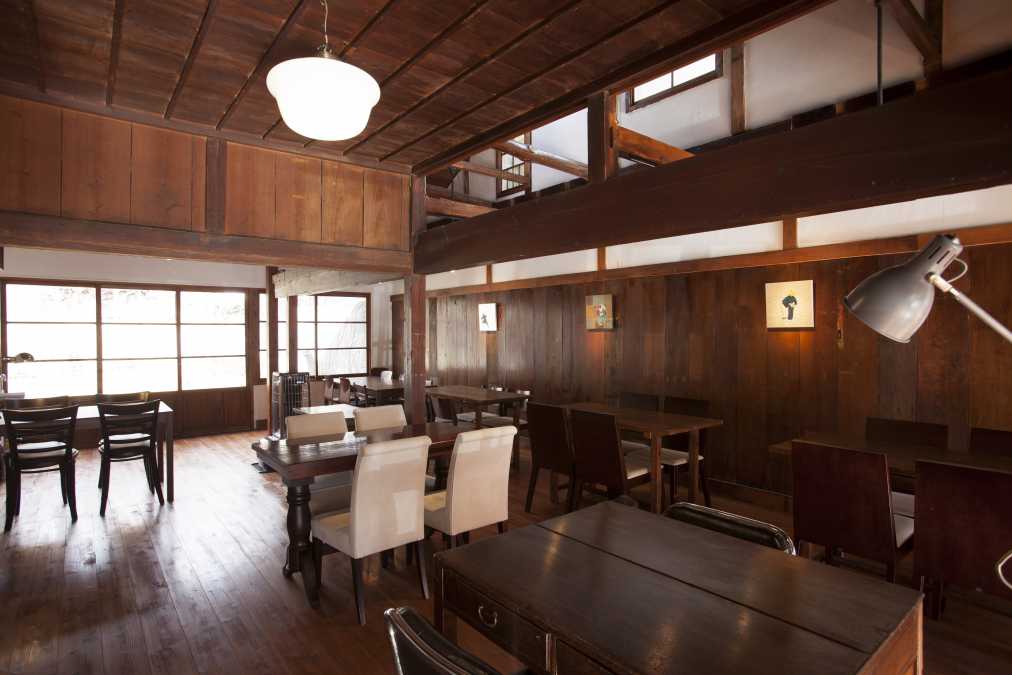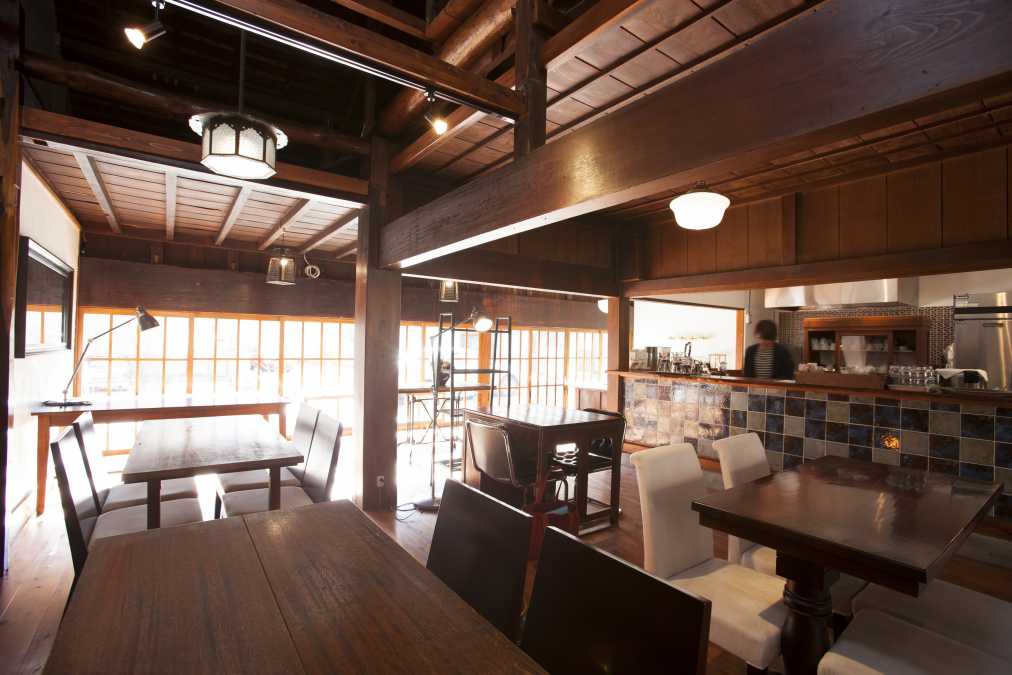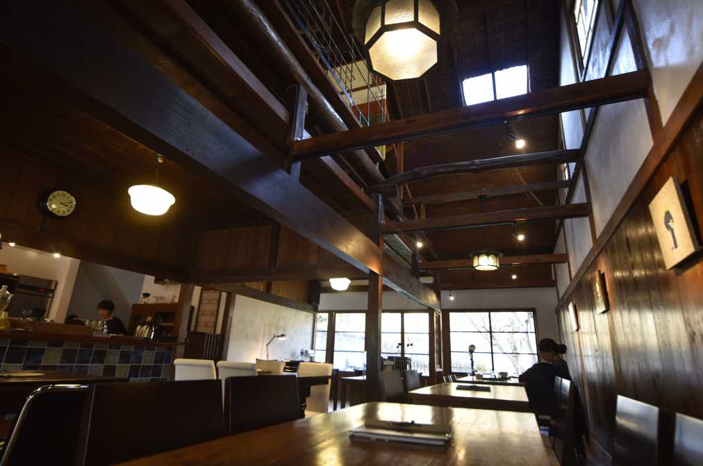お店の建物は昭和3年(1928)築で、米や麦を販売する商店として使われていたもの。味わい深い色合いのどっしりとした梁が印象的です。もともと床に使われていた板を再利用したという壁も渋くて、そこに飾られたモダンな忍者のアートでぐっとおしゃれな空間に。