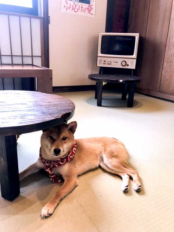 店内は畳風の床に、ちゃぶ台、アナログテレビが置かれており、まるで田舎のおばあちゃんの家のよう。懐かしい雰囲気に心がほっと和みます。おばあちゃん家と違うのは、ふりむくとそこで柴犬がくつろいでいること…!