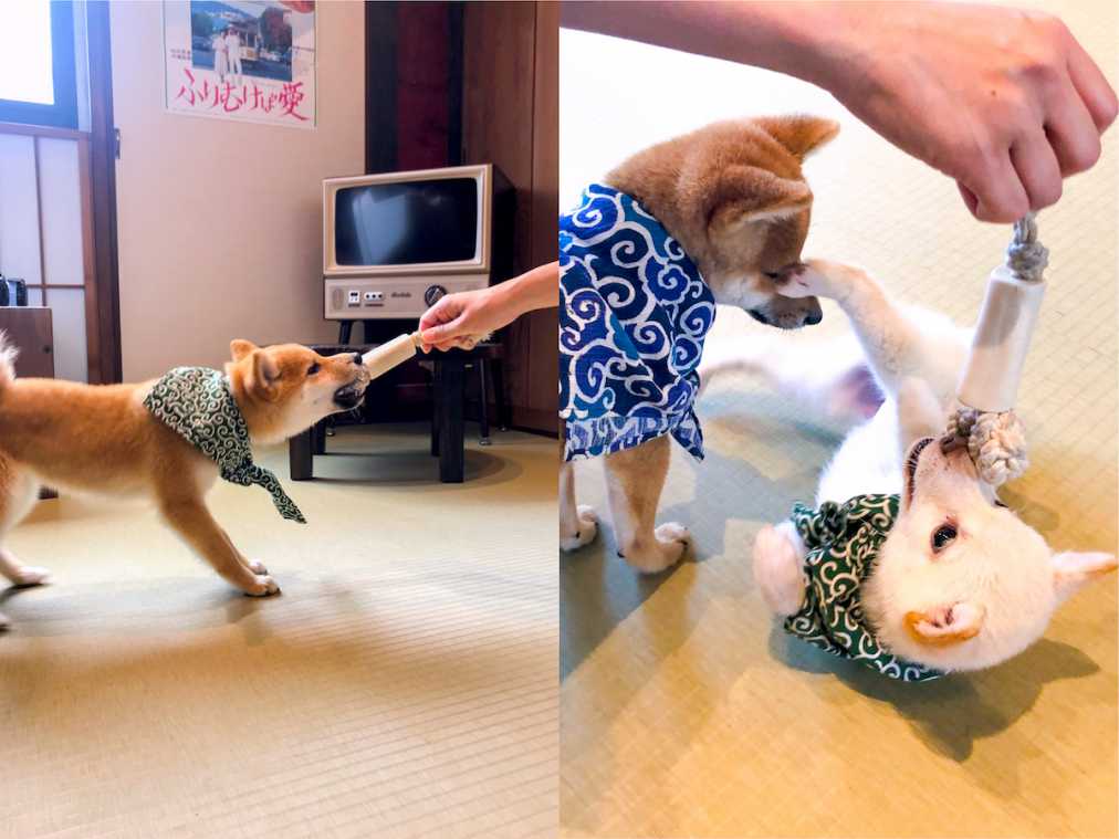 また、カフェ内には犬用のおもちゃが置かれており、一緒に遊ぶこともできます。多くの柴犬は自由気ままな性格なので、おもちゃで誘うのは一苦労!遊びのセンスが問われます…。その分うまく誘えたときの満足感たるや。おもちゃの引っ張り合いっこをしてはしゃいでいる間は、嫌なことなんて忘れてしまいますよ!