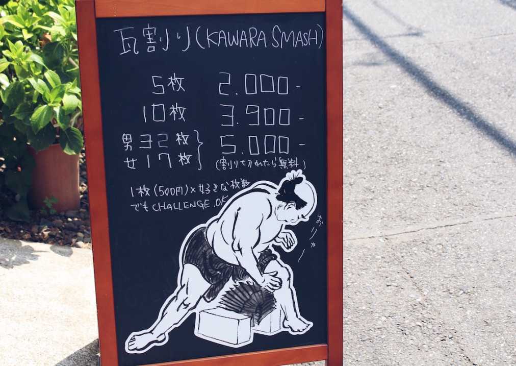 瓦割り体験のためにやってきたのは、浅草にある「瓦割りカワラナ」。ここは誰でも瓦割りが体験できるスポットです。1番人気は5枚割り(2000円)だということですが、お子さんや自信のない方は1枚(500円、枚数に応じて割引あり)から好きな枚数でチャレンジできます。