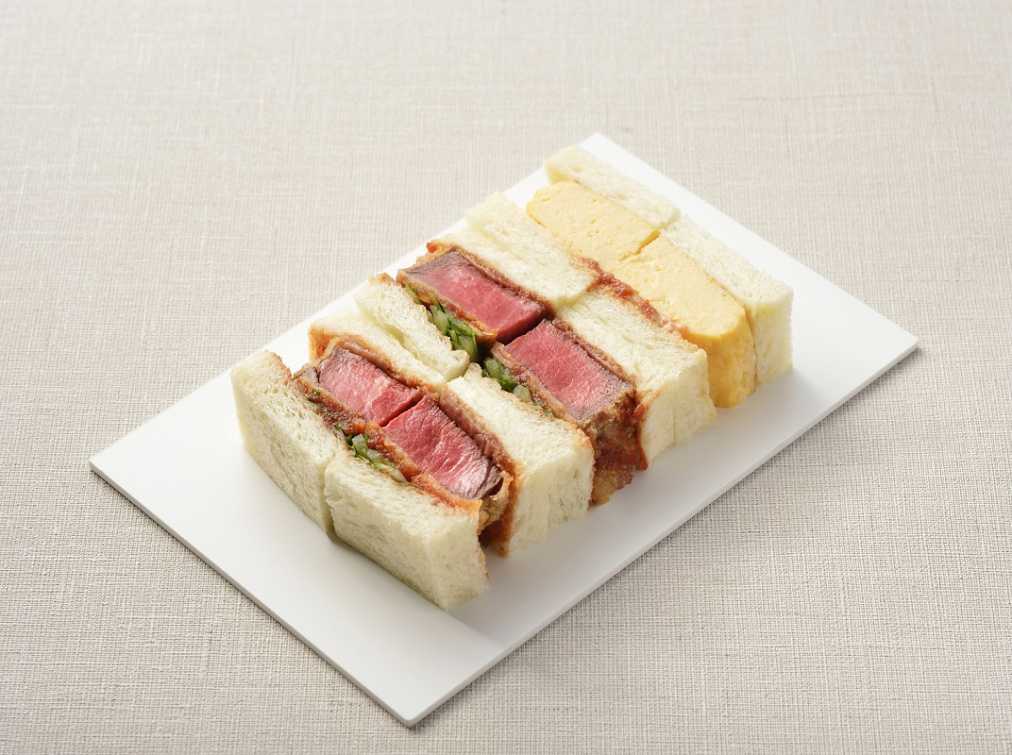 パンのしっとりふかふかの食感がたまらない「祇園おくむら」の「しば漬ビーフカツ&玉子サンド」2201円(1折)。ふっくらとしたオムレツと、火加減が絶妙のビーフカツの最強コンビサンド!※各日30点限り