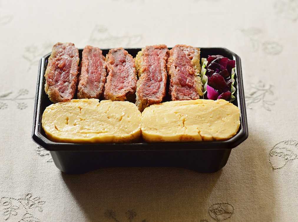 牛フィレカツと、「大徳寺 さいき家」のだし巻玉子が入った贅沢な「とり山卯吉」コラボ弁当。「ビーフフィレカツだし巻弁当」1944円(1折)。