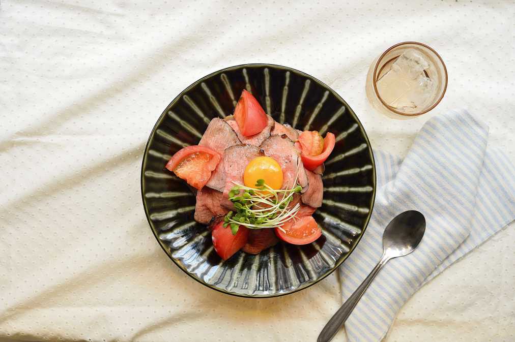 味はもちろん、盛り付けもうつくしい「前田珈琲」の「黒毛和牛ローストビーフ丼セット」2484円(ドリンク付/1人前)。しっとりやわらかいローストビーフがたまりません。