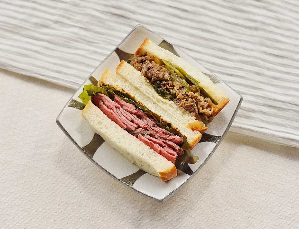 初登場となる「食パン専門店 プルンニャ」自慢のメニュー!京都牛と九条ネギ、京麩など、京都を代表する素材を使用した甘辛味の「京都牛のすき焼きサンドイッチ」1296円(2切入)と、「京都牛のローストビーフサンドイッチ」1620円(2切入)。