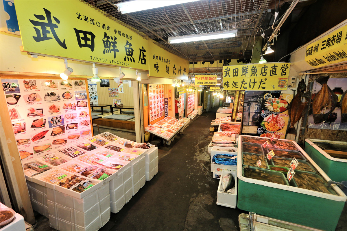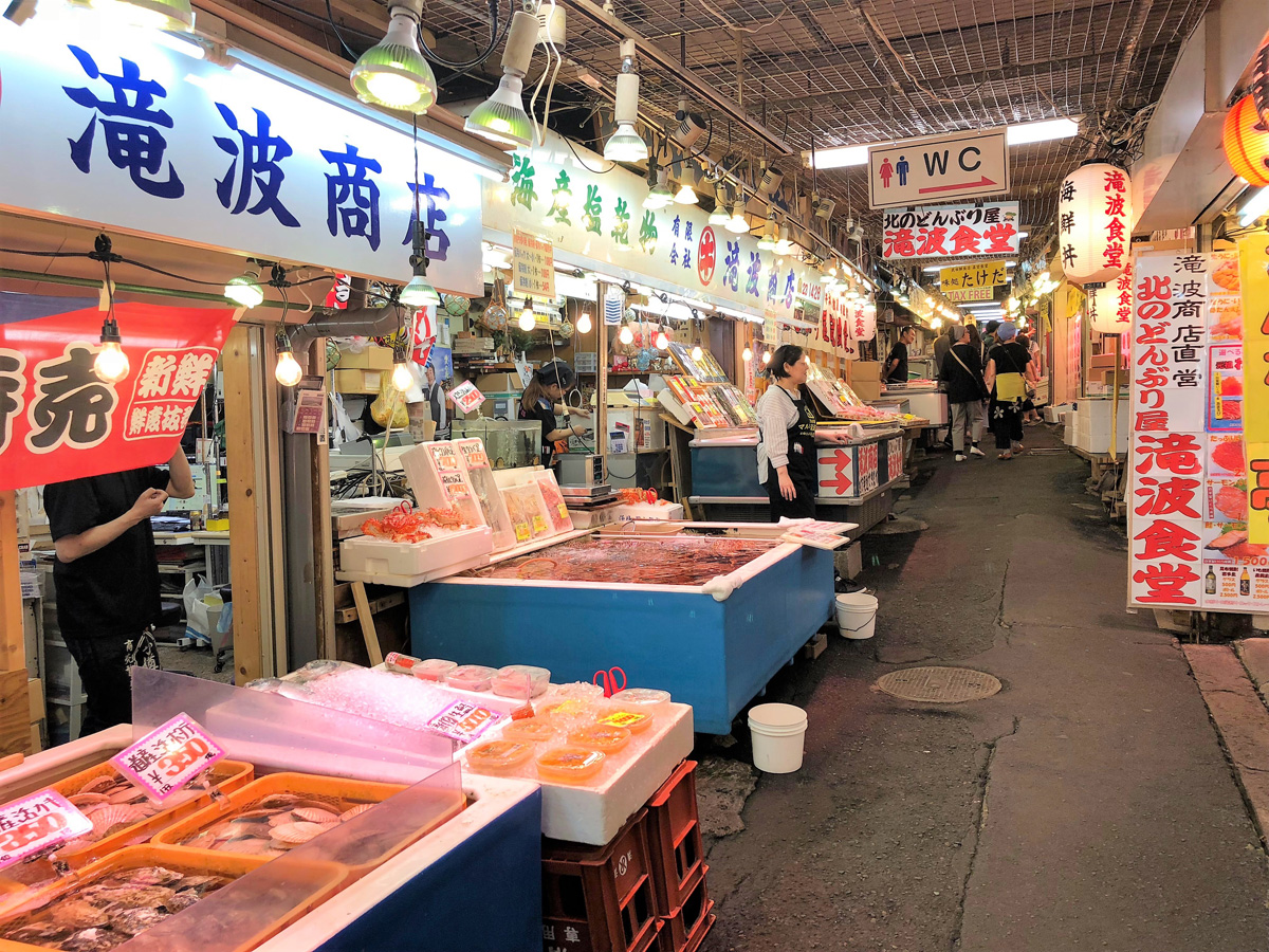 魚介類だけではなく、メロンやアスパラ、ジンギスカンなどのお土産も揃うので、観光客に大好評。市場内に3店舗を構える老舗の鮮魚店で、いくつもある水槽では水揚げされたばかりの魚介類がひしめき合っています。食堂の美味しさ、新鮮さにも納得。