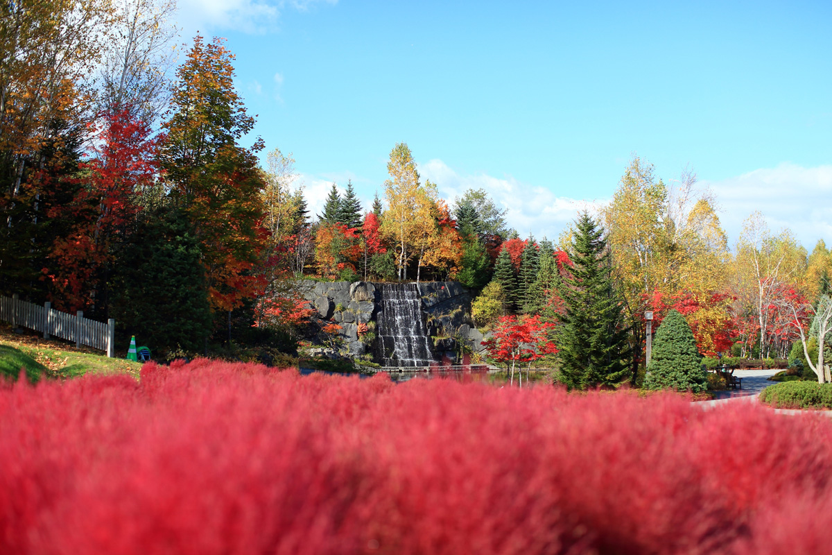 チューリップ、ラベンダー、ダリア、コスモスなど四季折々の美しい花々が約800種類も咲き誇る、北海道で唯一の国営公園。秋は真っ赤なコキアと、黄色やオレンジ色のカエデ類の紅葉を楽しめます。