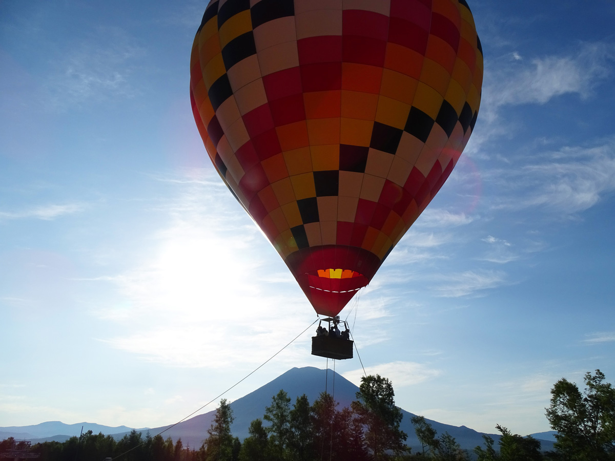 カラフルな熱気球に乗ってふんわり浮かぶと、ニセコの街並みや、鮮やかな緑に囲まれた羊蹄山、ニセコ連邦の山々を一望!