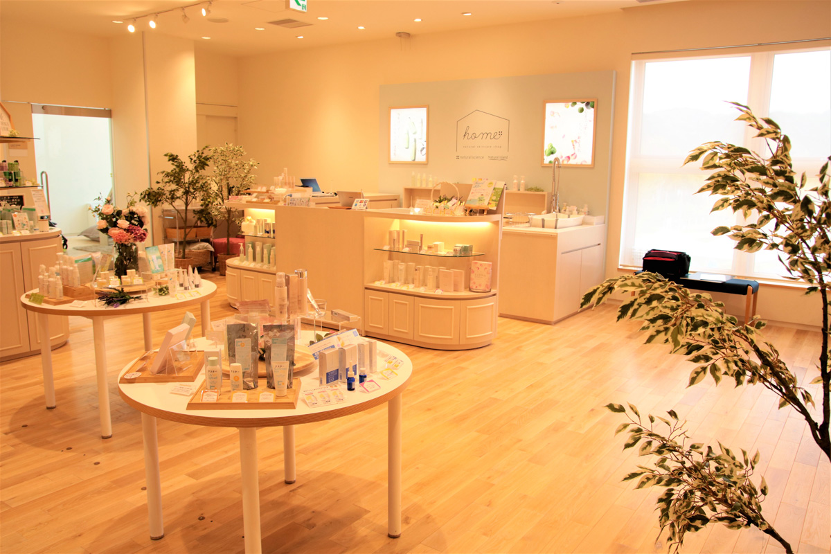 全商品を扱う2階の直営ショップ「home」では、赤ちゃんから大人まで使える化粧品など、お肌にやさしいアイテムを販売。カウンセラーが親切丁寧に、テスターでお試しもしながら相談にのってくれます。