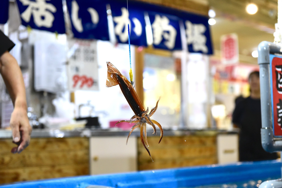 市場の中央にある「活いか釣堀」では、イカ釣りを体験。釣り竿の先でイカを引っ掛けるだけなので誰にでも簡単にできます。釣り上げたイカはその場で調理してもらい、コリコリとした食感を楽しみましょう。1回600円~で体験できます(入荷状況によって変動)。